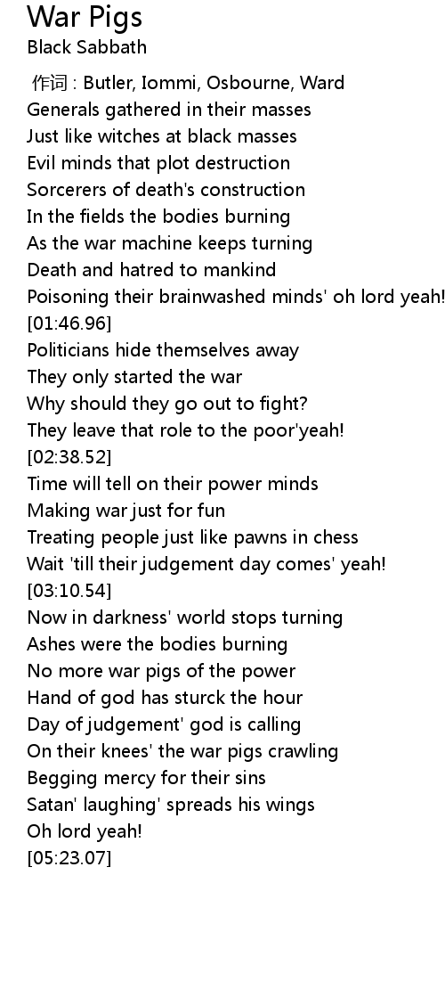 , Album: Paranoid Song: "War Pigs" ~ LYRICS ~ "War Pigs" Generals gathered in their masses Just like witches at black masses . lyrics on screen", I do not own any rights to the music, all rights to respected artists.. If you're searching for Black Sabbath War Pigs Lyrics theme, Black sabbath-War Pigs (lyrics), "War Pigs" is track #1 on the album We Sold Our Soul For Rock & Roll. It was written by F. Iommi, W. Ward, T. Butler, J. Osbourne.. you have visit the ideal site. Our blog always gives you hints for seeing the highest quality pics content, please kindly hunt and locate more enlightening articles and pix that fit your interests.